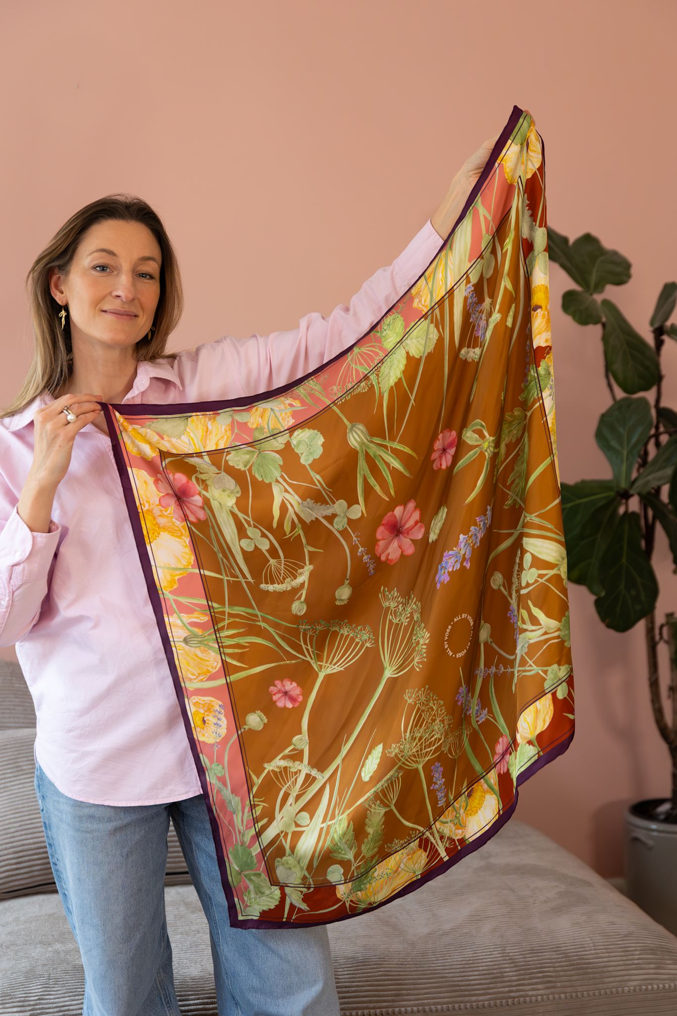 Langs kanten er silken rullet og håndsyet, hvilket giver et ekslusivt udtryk og en flot afslutning. Denne detalje er også med til at komplimentere de håndmalede akvareller, der er trykt på silken, og løfter tørklædet til et højt æstetisk niveau.