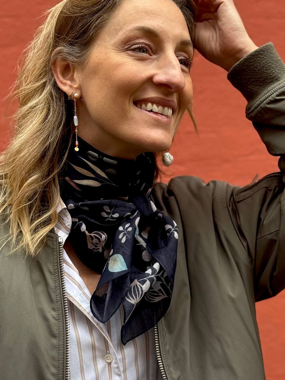 Størrelsen egner sig perfekt som et tørklæde i halsen eller hvor det kan vikles rundt et par gange om hovedet som hårbånd.