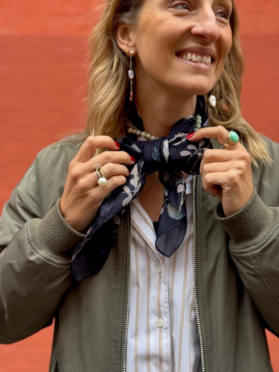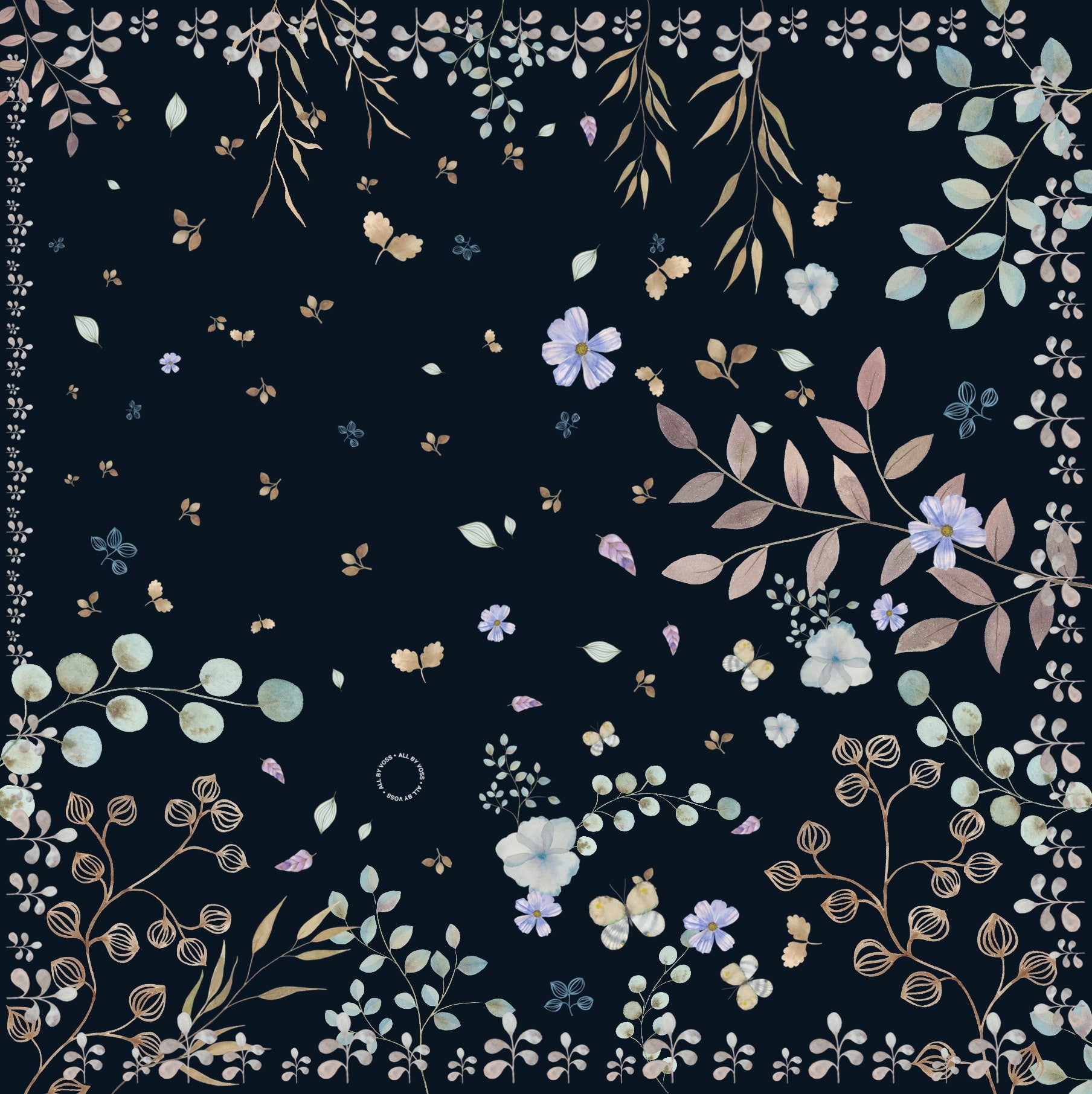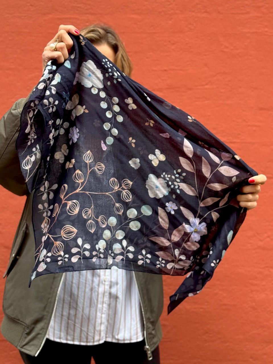 Tørklædet er en smuk komposition af akvareller på mørkeblå bund.