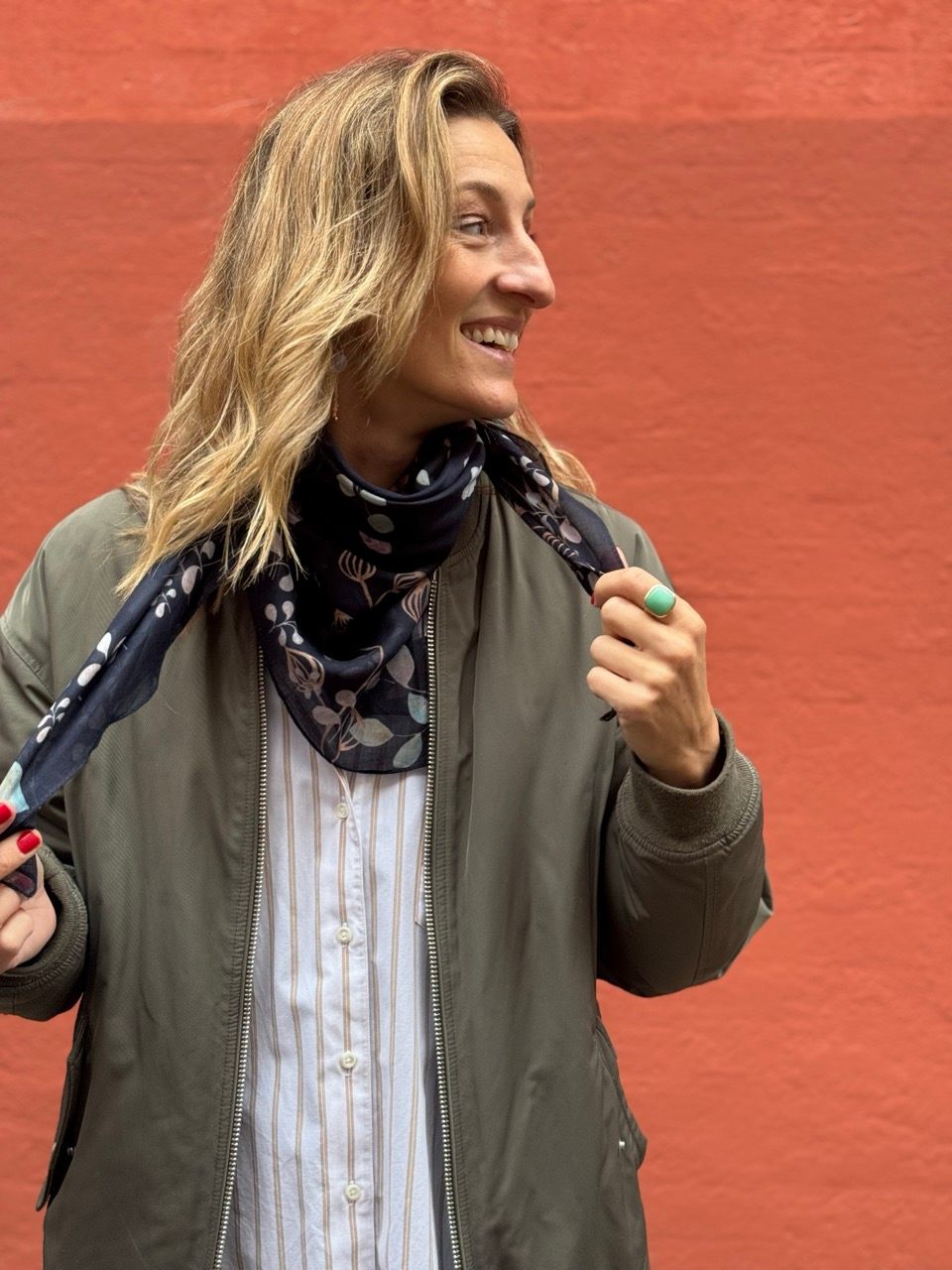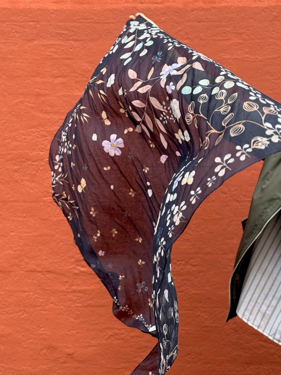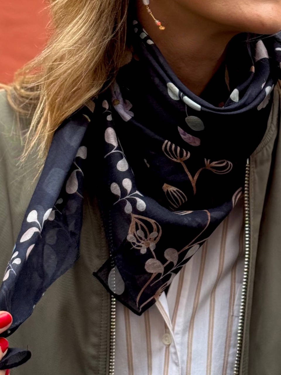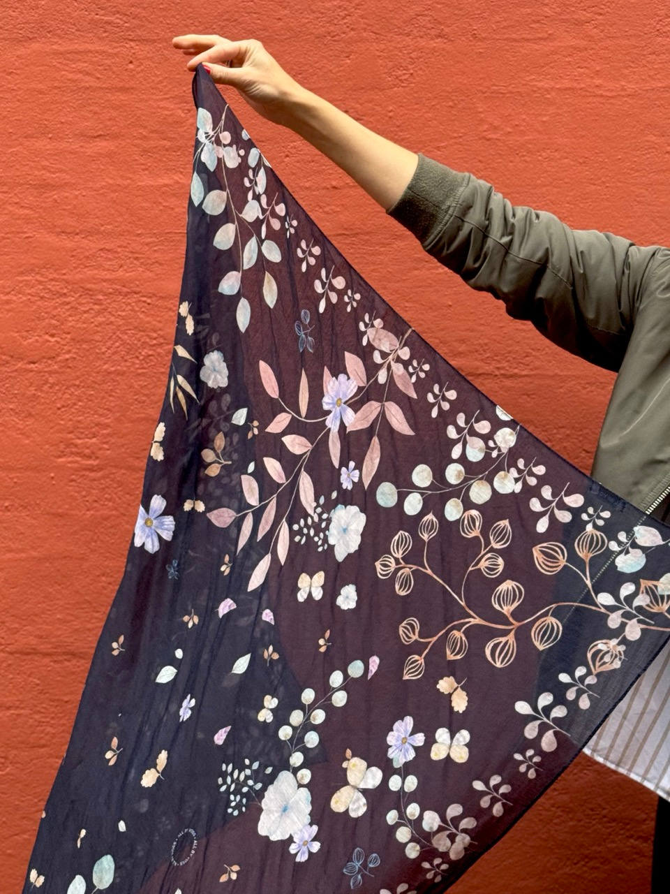 Tørklædet er en smuk komposition af akvareller på mørkeblå bund.