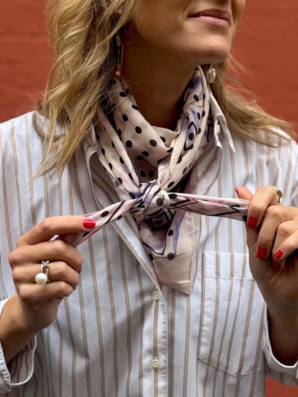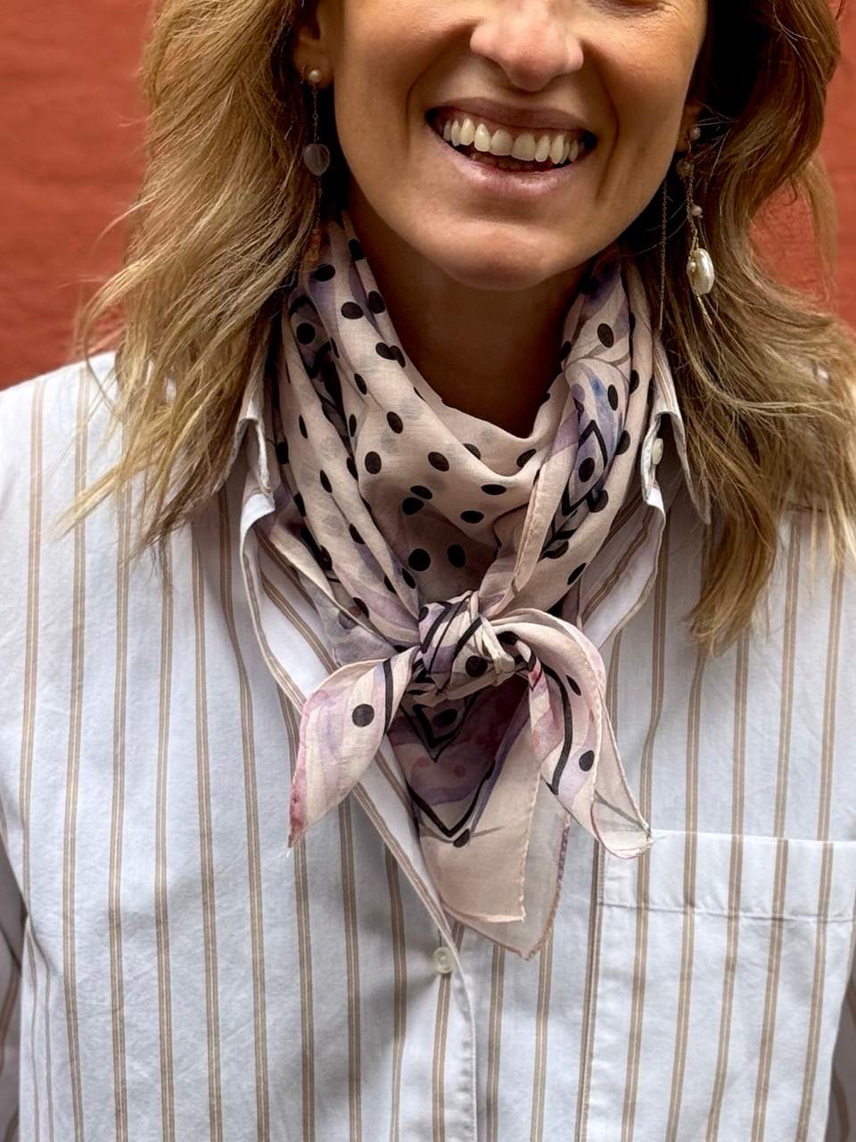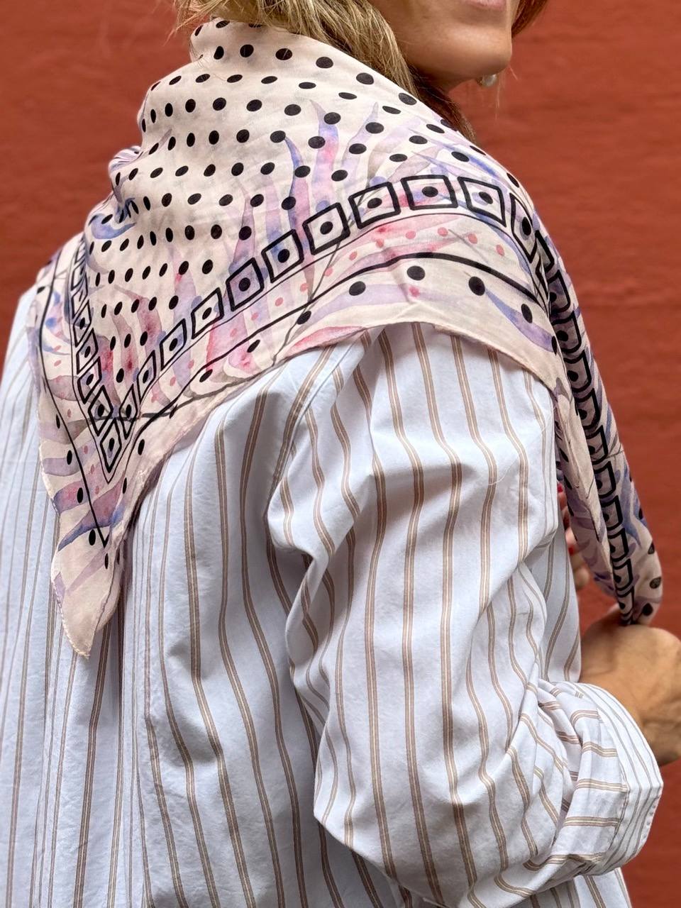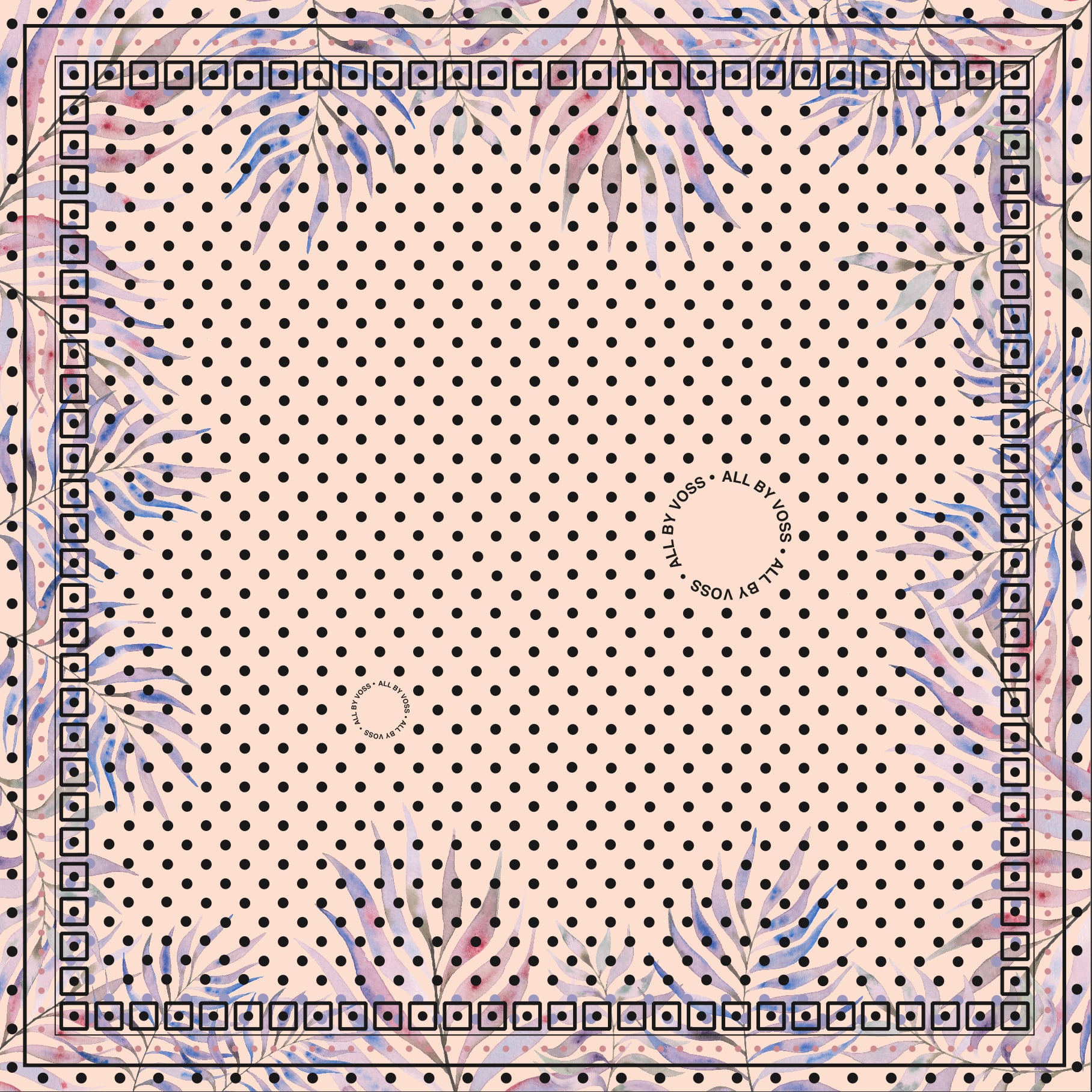 Tørklædet er en smuk komposition af akvareller på sart ferskenfarvet bund med sorte polkaprikker.
