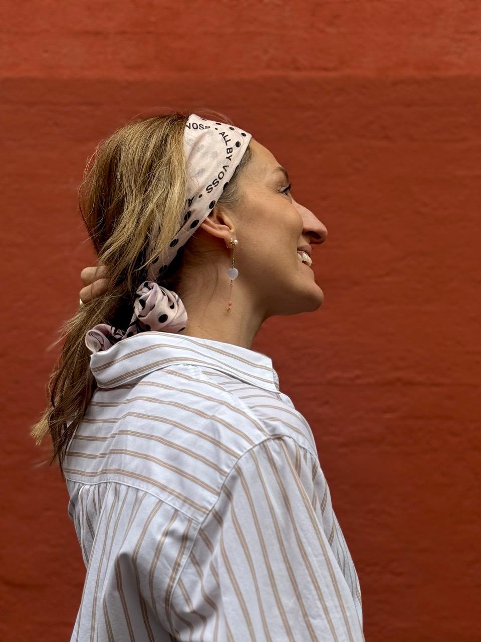 Størrelsen egner sig perfekt som et tørklæde i halsen eller hvor det kan vikles rundt et par gange om hovedet som hårbånd.
