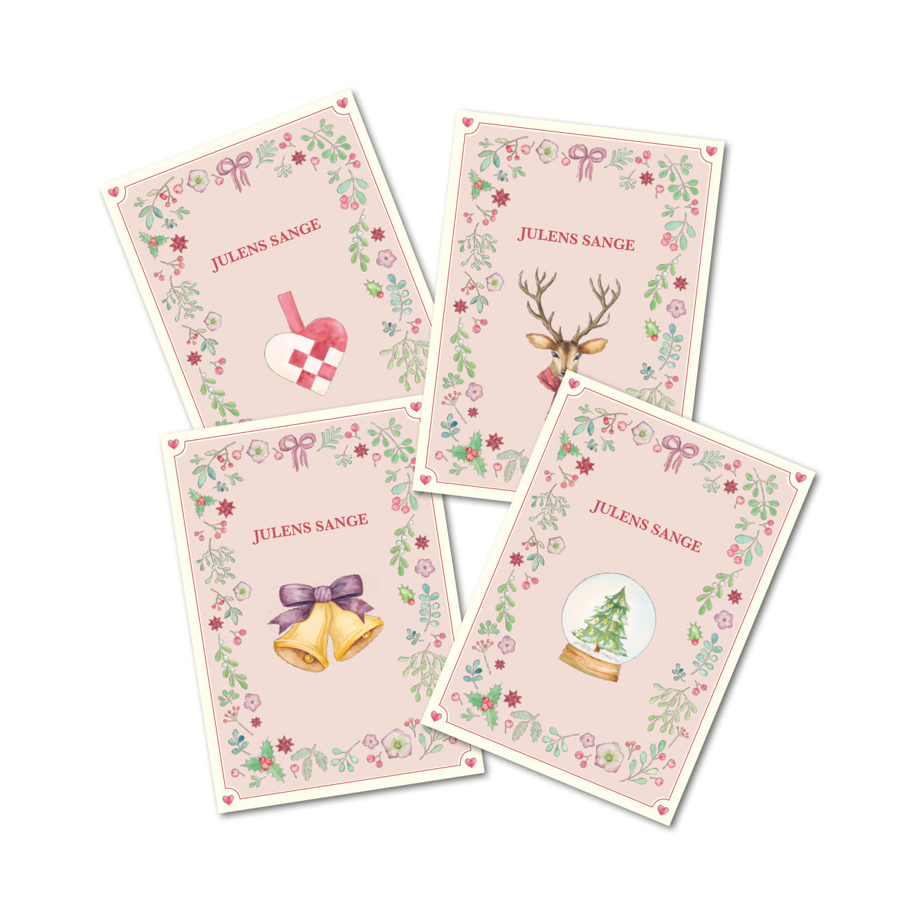Hæftet indeholder julens sange, - både de familievenlige og traditionsbundne af slagsen. Inde i hæftet er der dekoreret med forskellige akvareller, der alle er originalmotiver malet af Annemette Voss Fridthjof, - og efterfølgende er de scannet ind i høj opløsning for bedst mulig gengivelse.