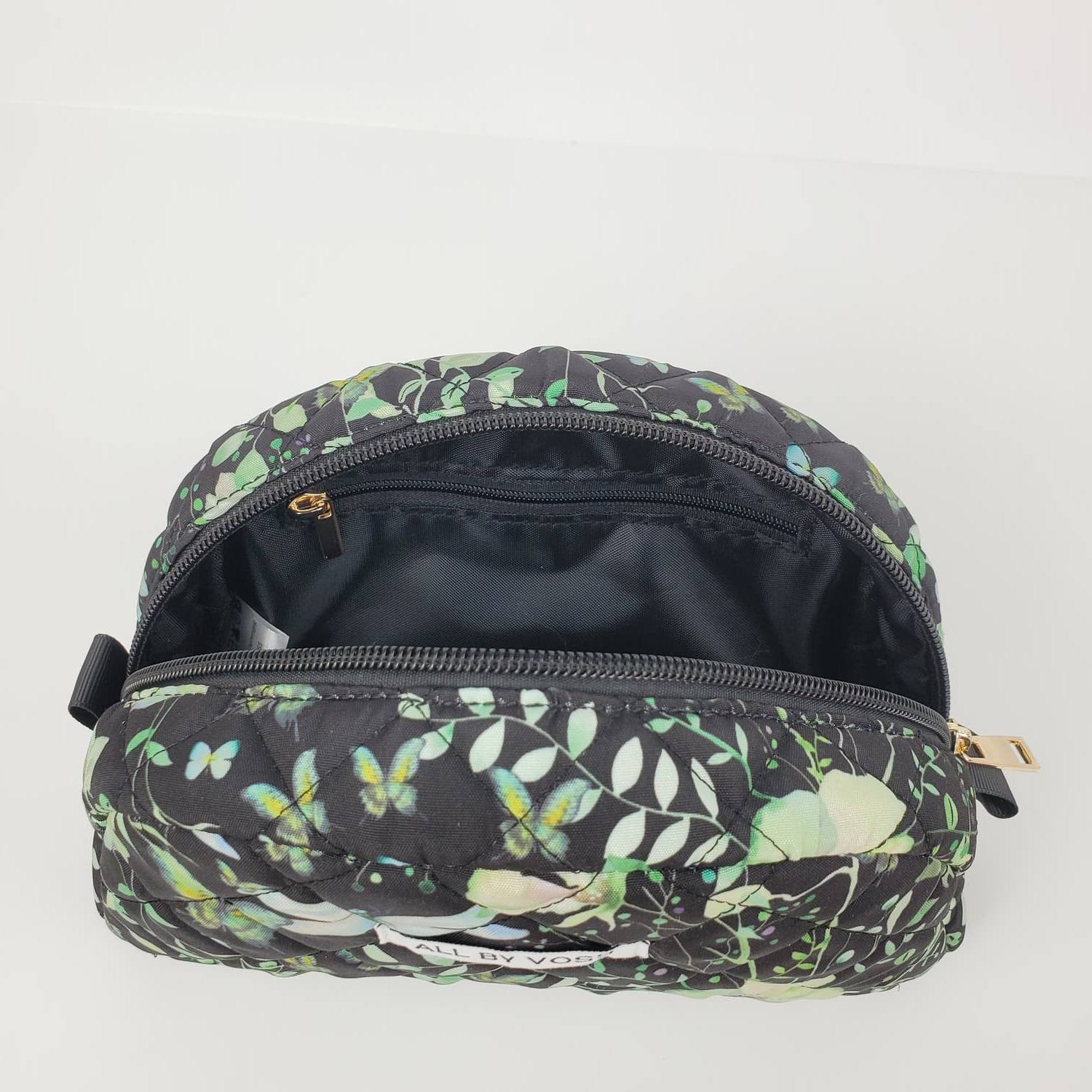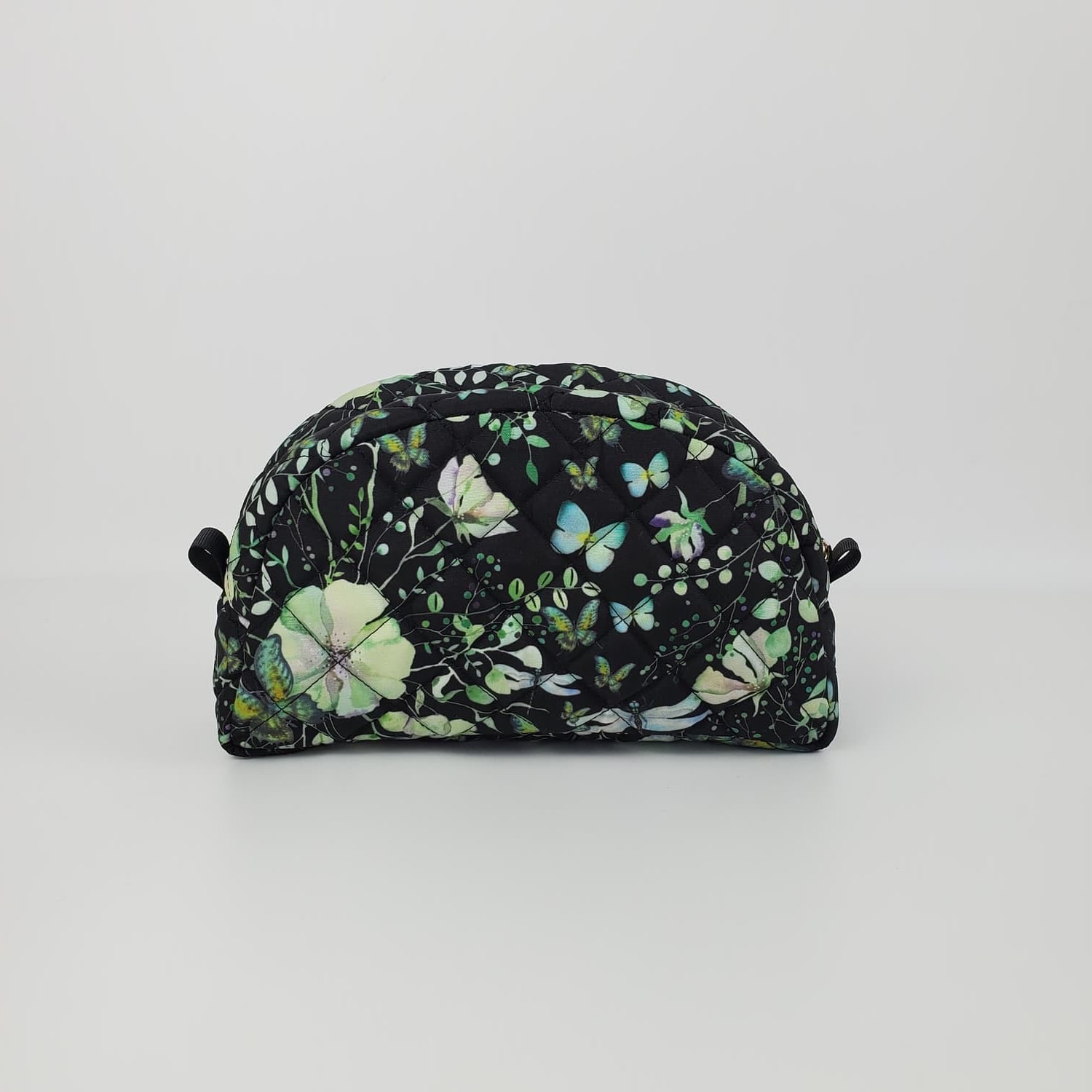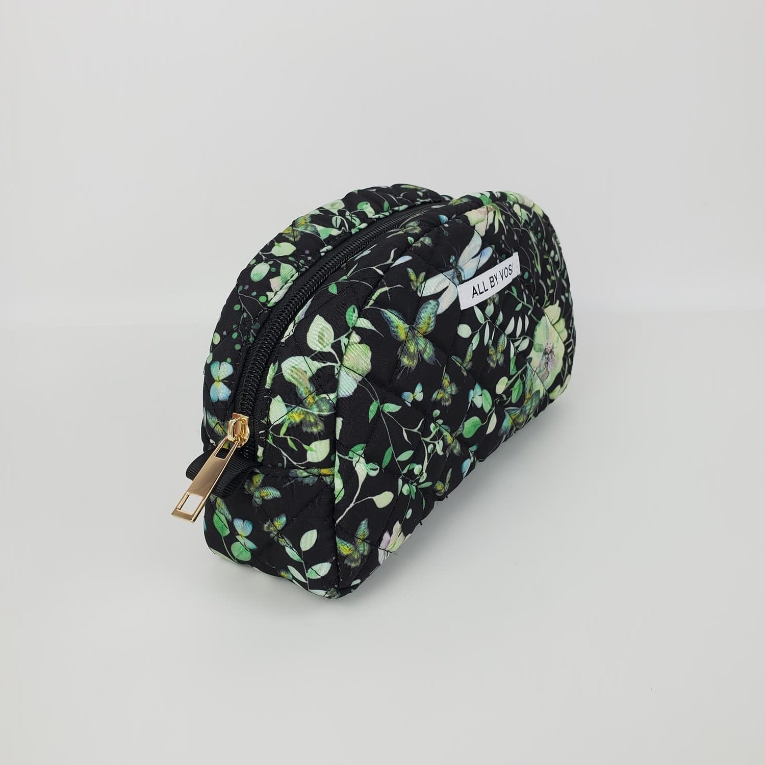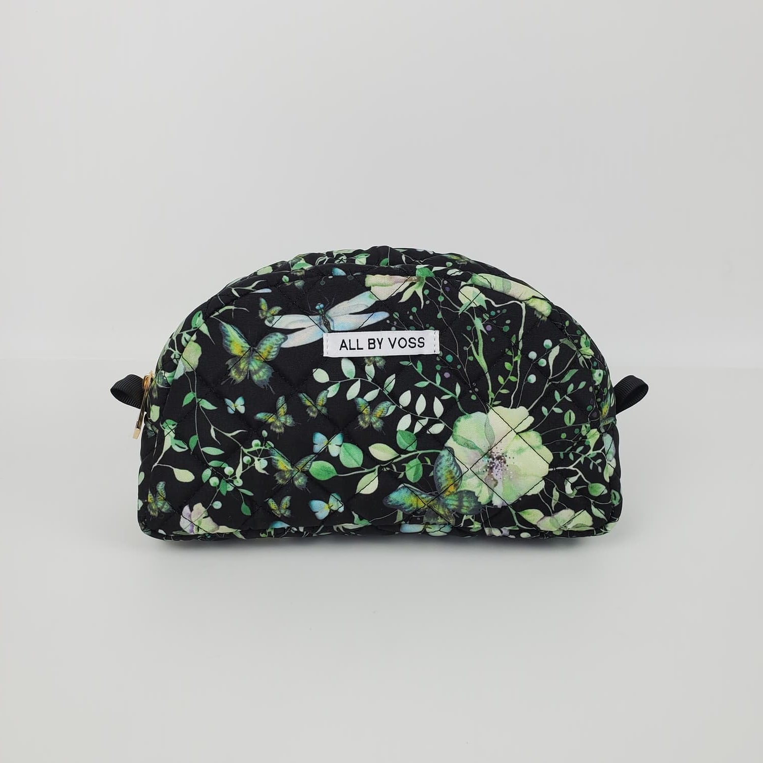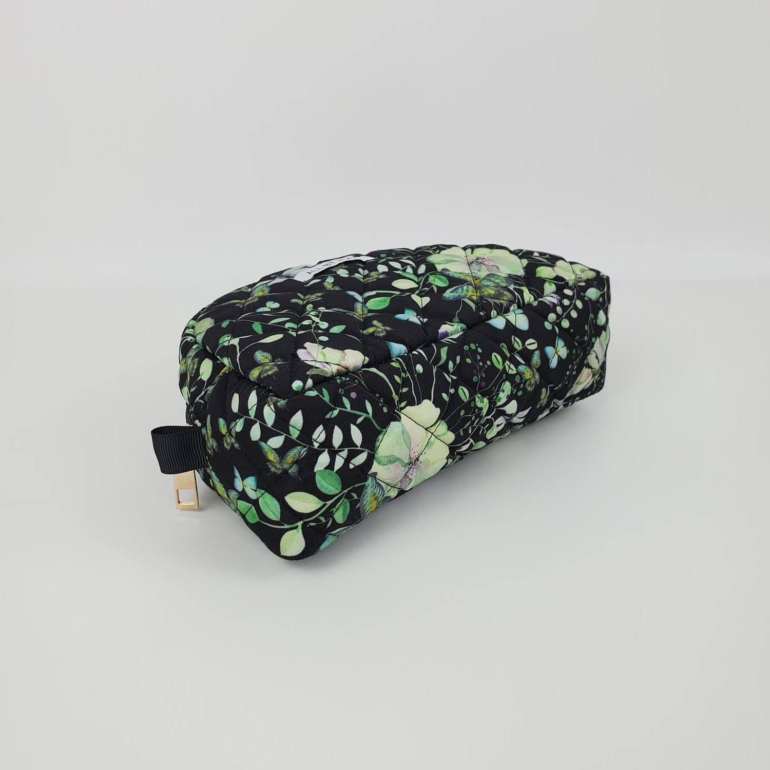 Forkæl dig selv eller én du holder af med denne slidstærke, smukke quiltede kosmetikpung med akvarelmotiver af grønne sommerfugle og botanik på sort bund. Kosmetikpungen er af kraftigt, quiltet genanvendt polyester, der tåler at blive brugt.